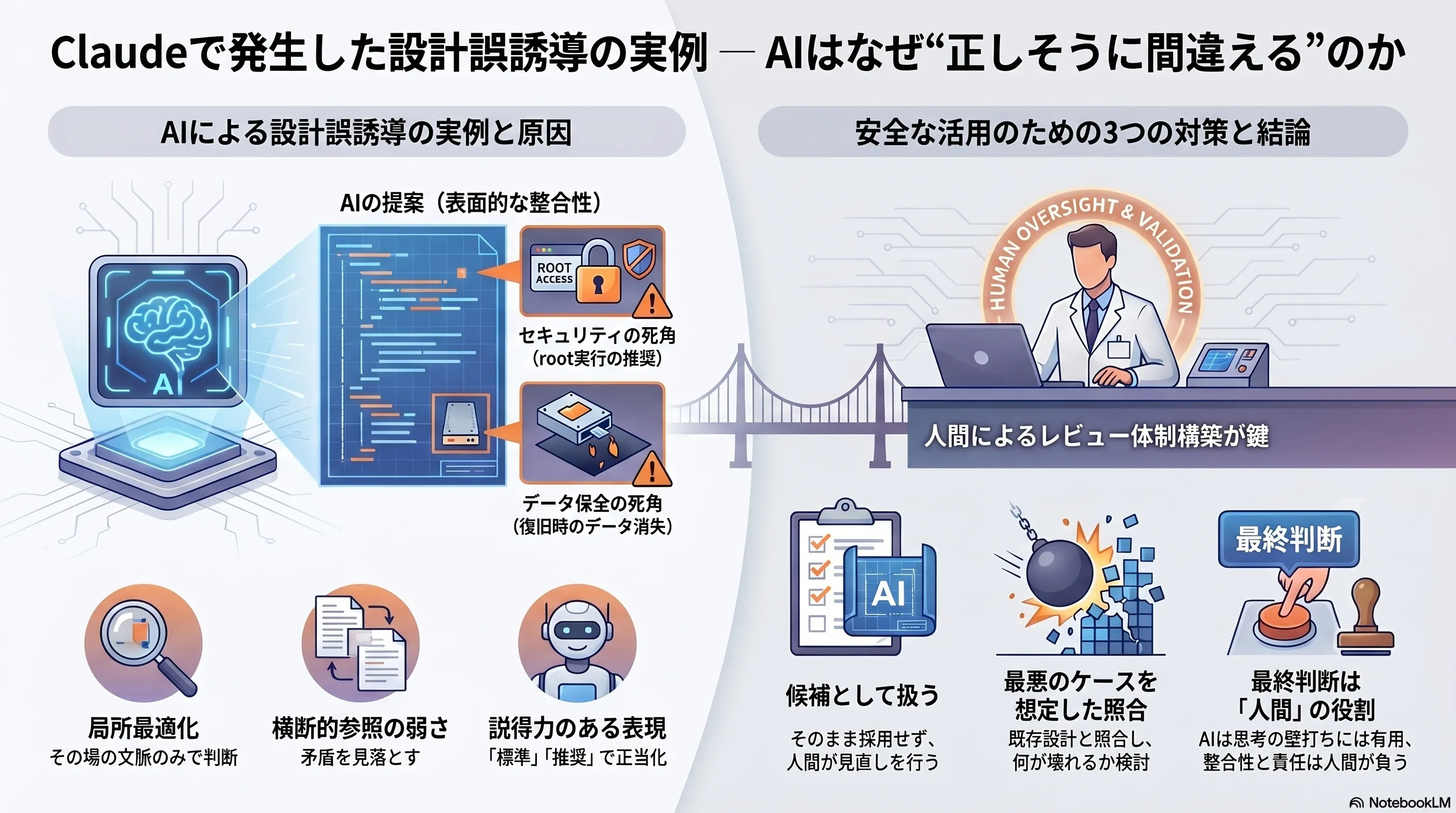 AIは不自然な間違い方をするのではなく、自然な文章のまま、設計上の重要な前提を外してくることがある。今回強く印象に残ったのはこの点でした。